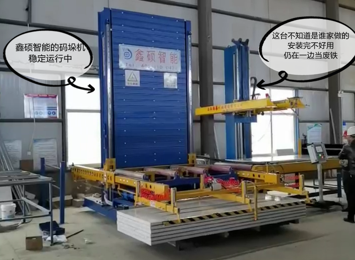 今日,山西客戶新定的兩臺(tái)彩鋼夾芯板碼垛機(jī)順利安裝調(diào)試并投入生產(chǎn)使用。此前該客戶于其他夾芯板碼垛機(jī)廠家定制一臺(tái)碼垛機(jī)設(shè)備,安裝之后始終問題不斷導(dǎo)致客戶無法正常使用,無奈之下只能仍在一邊。然后于遼寧鑫碩智能機(jī)械,定制3臺(tái)彩鋼夾芯板碼垛機(jī)器人。安裝調(diào)試之后,一直穩(wěn)定運(yùn)行使用中??蛻艚o予鑫碩智能高度認(rèn)可。
